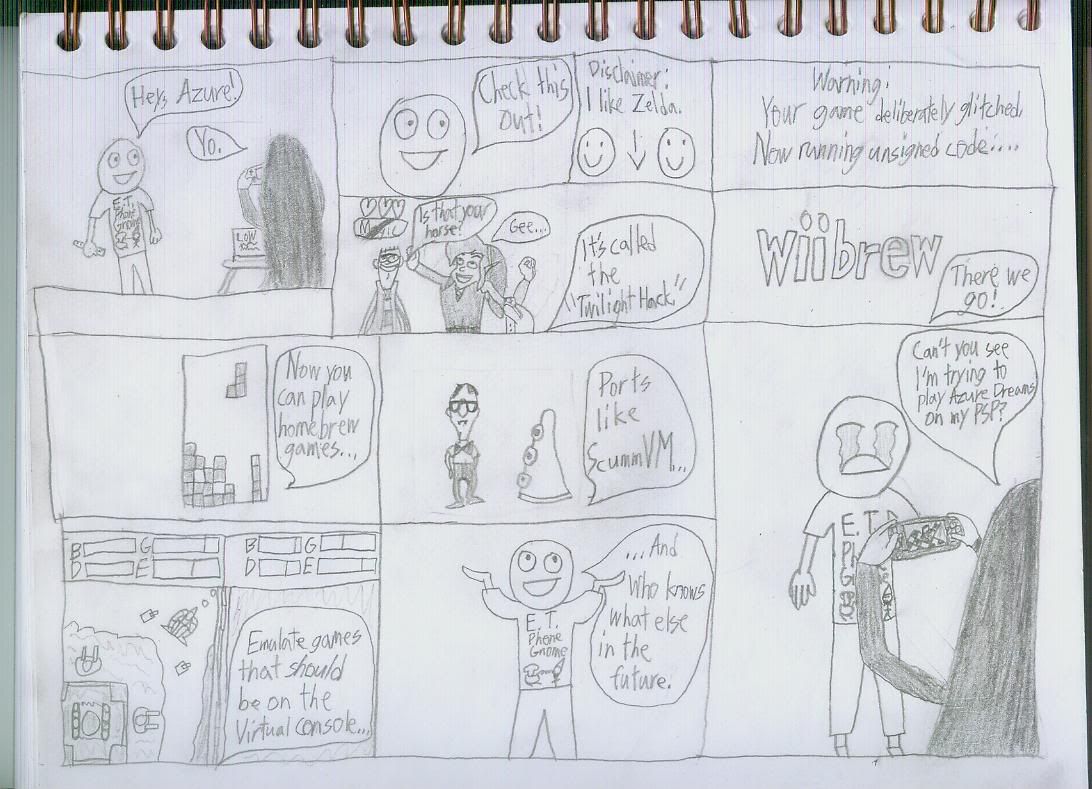 I used to have my own comic site with me and three of my friends. Their far superior drawing skills (and generally bad ideas) discouraged me and the site ended, with us barely uploading anything at all. We probably should've used my ideas and had them redraw my comics, along with somebody more competent designing the page layout, but that never happened and the site was pretty much forgotten. It might still be on the internet, I have no idea. I think it was on Geocities, we called it Quackstache Comics (based on a character i made in Graffiti Kingdom). I always like to sneak little details into all the comics I make. Oftentimes, in my actual series comics, I would recycle old character designs or give them small background cameos. This comic, I will probably draw more of. These are LoW exclusive comics, and so instead of using my real name, my character is named "Azure", and I wear a Death Tank T-Shirt, since that involves my LoW name. I tried hard to copy the designs from various games. The Tetris is obviously the famous Tetris homebrew game on Wii. The other two are real games as well, see if you can't figure out what they are. Frame 4 (the Twilight Hack frame), contains at least three jokes, I liked drawing this part. XD ...and yes, I really do own a PSP, and it rocks. I'm not dissing the Twilight Hack, I think it's very cool and will potentially make better use of the Wii controls than any developer has so far, but it's basically a "PSP could do all that first, and it's portable" joke. Edited by DeathTankZwei, Jun 11 2008, 07:54 PM.