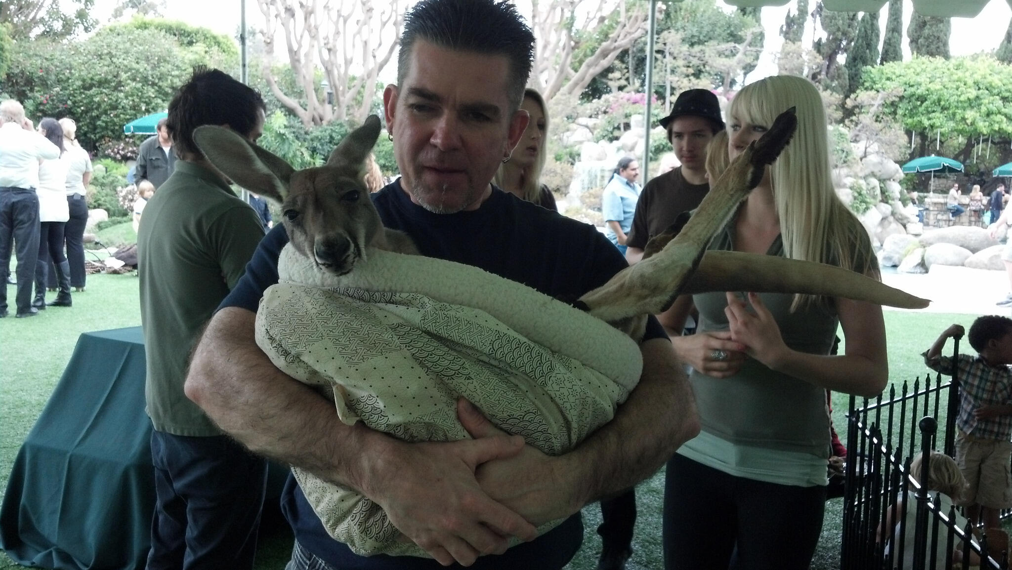 I love the pictures. The kangaroo not sure why the little fellow didn't kick his way to freedom, maybe he was a baby and liked to be bundled up. The flowers and grounds were beautiful. Hef looked better in those pictures |