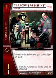 I personally really do not care much for the Cobra Hyde combo. I just don't think these characters add very much on their own. Stilt-Man is da bomb, you don't want to loose him. Roscoe is always good though, but you'll miss your 1 drop for reinforcing. And how long will it take before your choose not to recover your Roscoe? I've tried to play with him, but he would have been so much better concealed. Now he's just not good enough. But that's just my opinion. Feel free to edit the deck anyway you like. Anymore Crime Lords fans out there? 12 low drops maybe a little too much, agreed. But Carbone's Assassins can always be used later when you decide to underdrop for a little extra reinforcing. Jester can be switched out for the very excellent Masked Marauder, Frank Farnum! So how about: -2 Carbone's Assassins -2 Jester +2 Masked Marauder +2 Shakedown (characters + this turn = sweet)